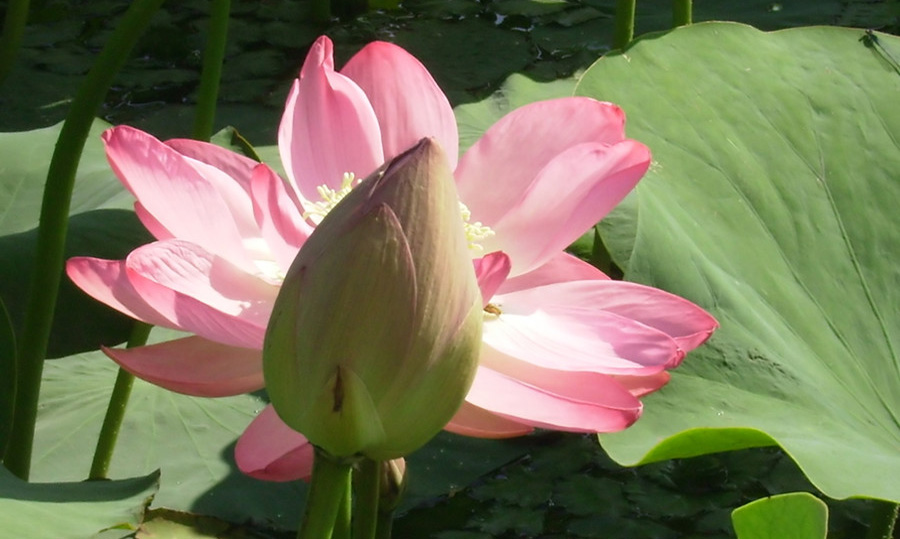 The roots of Nelumbo nucifera are planted in the soil of the pond or river bottom, while the leaves float on top of the water surface. The flowers are usually found on thick stems rising several centimeters above the water. The plant normally grows up to a height of about 150 cm and a horizontal spread of up to 3 meters, but some unverified reports place the height as high as over 5 meters. The leaves may be as large as 60 cm in diameter, while the showy flowers can be up to 20 cm in diameter.