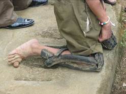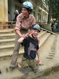 One afternoon I spotted a man walking on his knees. He had been to both the dental and pharmacy clinics. I thought he had cerebral palsy, as he was uncoordinated and being helped by his two friends that brought him to the clinic. His friends had fashioned ‘shoes’ from portions of mo-ped tires wired around his lower legs and knees to protect them from dragging on the ground. What a joyful man this was, shaking my hands in gratefulness and wanting his picture taken! Madam Mai, in full view of all the locals, pulled out a wad of cash, and helped him get it in his shirt pocket. His friends carried him and placed him on a moped, sandwiching him safely between themselves, and off they went with huge smiles. Madam Mai and I had tears in our eyes as we hugged and watched them drive away.