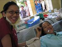 We saw many of the old women, permanently bent way over from years of rice farming. They were so small and shriveled, seeming hardly more than walking punctuation marks. We shuffled them through dental work, getting glasses, and treated them for debilitating arthritis and the like. Many of them wore their very best clothes to see the doctor. They were particularly entertained by our tallest members who towered over them.