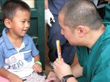 I was fetched to see a young patient who seemed autistic; he was hitting and spitting on everyone. The team put a mask on him, a ‘spit catcher’. When I arrived, he was hungrily reaching out to anyone who would hold his hand, restless and ready to strike out. The father had to force him forward into MA. He was being oppositional and difficult to manage, so I put my hand on his back and began to comfort him. He immediately became very calm and gentle. I sang to him and rubbed his back. When it was time for the father to move him to the next room, he lashed out again. So I stood a ways before him, extending my open hand. The father went to push him forward, but I gently stopped him. After a few moments, the child reached out to me and put his hand in mine. I sang to him as I led him to his next stop. The father looked amazed, seeming to see for the first time how tenderness and patience was enough. I got a father’s smile for a reward.